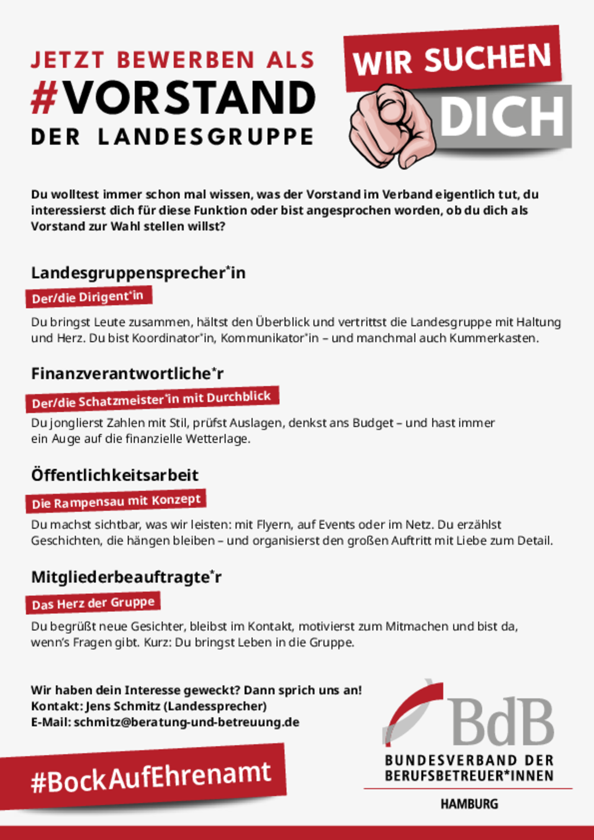 Für ihr hartnäckiges Engagement im Interesse der Berufsbetreuer*innen ist die BdB-Landesgruppe Hamburg bekannt. Der Landesvorstand braucht nun Verstärkung und ruft zum Mitmachen auf. Grund dafür ist das Ausscheiden der langjährig Aktiven, die bei der kommenden Vorstandswahl nicht mehr antreten werden. Um die engagierte Arbeit des Landesvorstands fortsetzen zu können, hat dieser folgenden Aufruf gestartet und dazu auch einen Flyer entwickelt: