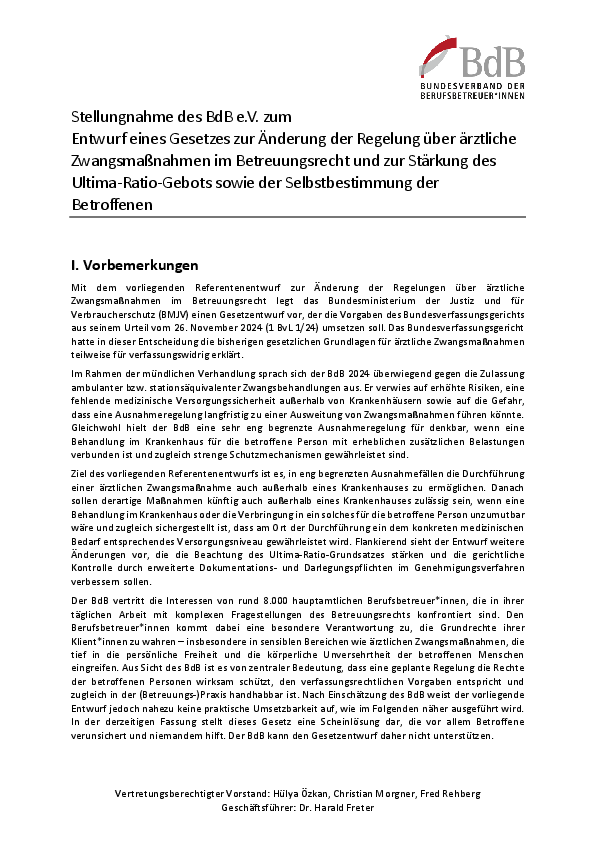 Mit dem Referentenentwurf zur Änderung der Regelungen über ärztliche Zwangsmaßnahmen im Betreuungsrecht legt das Bundesministerium der Justiz und für Verbraucherschutz (BMJV) einen Gesetzentwurf vor, der die Vorgaben des Bundesverfassungsgerichts aus seinem Urteil vom 26. November 2024 (1 BvL 1/24) umsetzen soll. Das Bundesverfassungsgericht hatte in dieser Entscheidung die bisherigen gesetzlichen Grundlagen für ärztliche Zwangsmaßnahmen teilweise für verfassungswidrig erklärt. Im Rahmen der mündlichen Verhandlung sprach sich der BdB 2024 überwiegend gegen die Zulassung ambulanter bzw. stationsäquivalenter Zwangsbehandlungen aus. Aus Sicht des BdB ist es von zentraler Bedeutung, dass eine geplante Regelung die Rechte der betroffenen Personen wirksam schützt, den verfassungsrechtlichen Vorgaben entspricht und zugleich in der (Betreuungs-)Praxis handhabbar ist. Nach Einschätzung des BdB weist der vorliegende Entwurf jedoch nahezu keine praktische Umsetzbarkeit auf. In der derzeitigen Fassung stellt dieses Gesetz eine Scheinlösung dar, die vor allem Betroffene verunsichert und niemandem hilft. Der BdB kann den Gesetzentwurf daher nicht unterstützen.