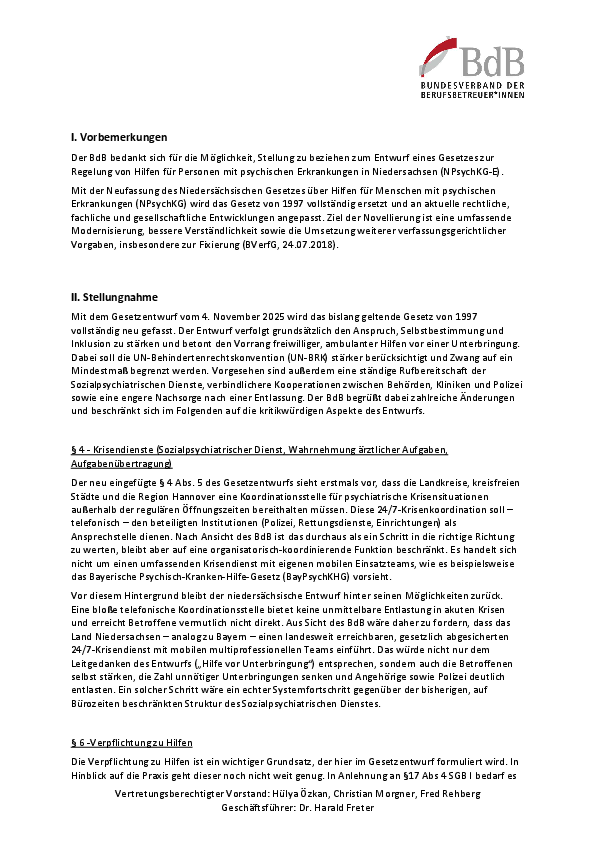 zum Entwurf eines Gesetzes zur Regelung von Hilfen für Personen mit psychischen Erkrankungen in Niedersachsen (NPsychKG-E)
