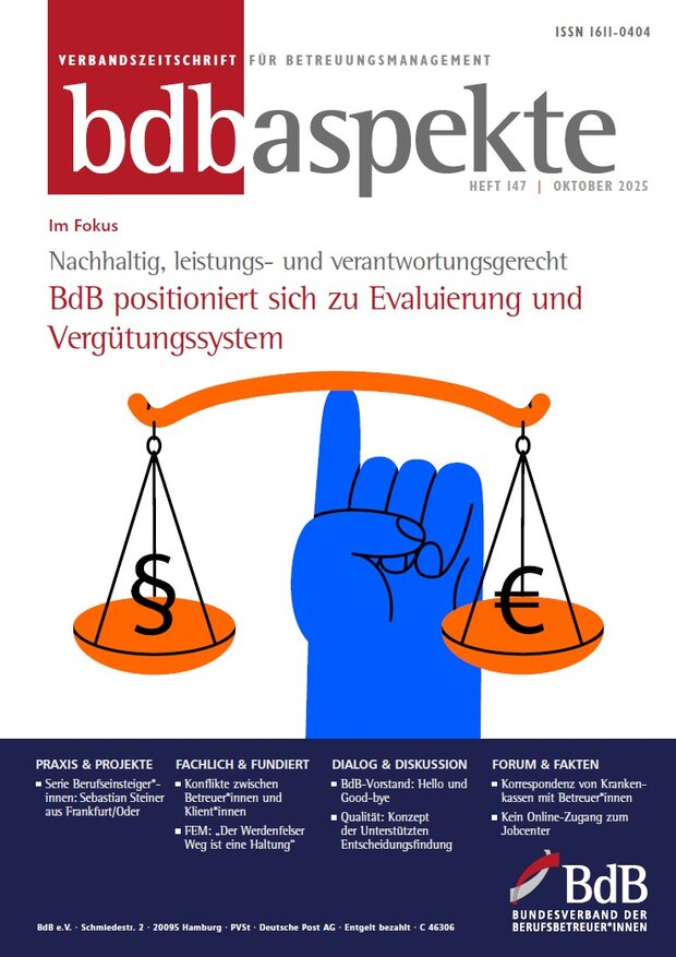 Die bdbaspekte diskutiert Perspektiven, stellt Menschen im Betreuungswesen vor und informiert über neue Rechtsprechungen und Gesetze. Das Magazin erscheint viermal im Jahr.